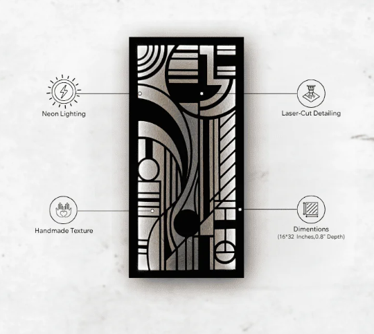 This modern geometric wall art combines clean lines, curves, and abstract symmetry with the warmth of handmade craftsmanship. Laser-cut from premium black wood and illuminated with a soft LED backlight, this wall piece is the perfect addition to modern living rooms, hallways, offices, or bedrooms. Its sleek design blends contemporary style with visual depth and ambient lighting.
